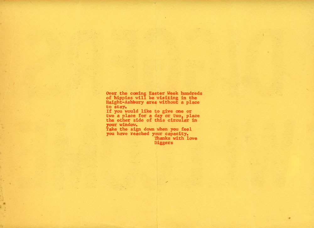Heady Daze July 9, 2014 Eric Leave a comment Recent addition to the Digger Archives. Haven’t figured out where to place this in the site yet. ComCo (most likely) printed this. The reverse side had the following instructions: This was March, 1967. Optimism abounding. Share this: Click to share on X (Opens in new window) X Click to share on Facebook (Opens in new window) Facebook Like Loading... Related