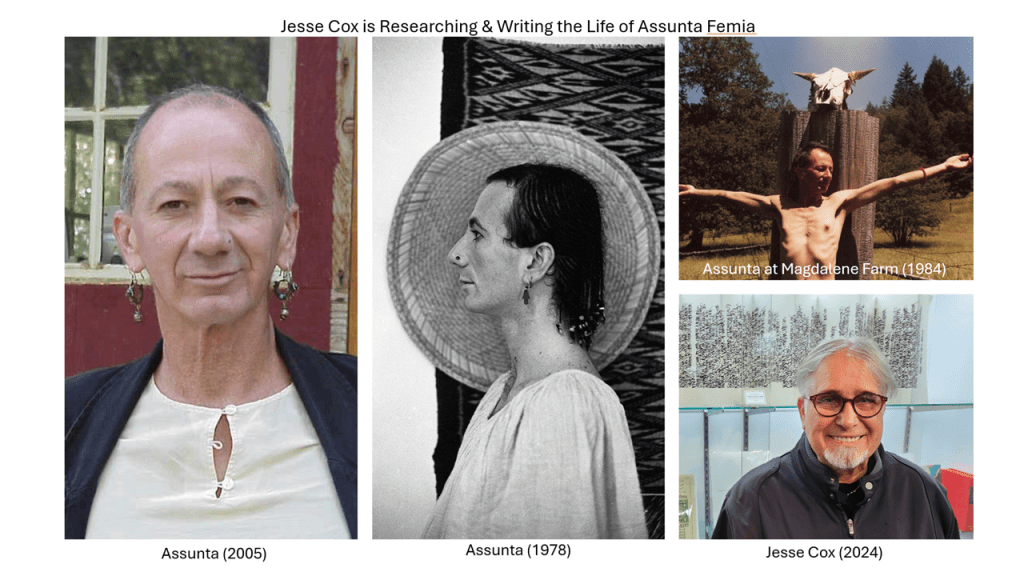 Many of you have contributed to previous GoFundMe projects of The Digger Archives. This is another fundraising plea to help preserve our tribe’s history. Jesse Cox is a people’s historian of the most authentic variety. Jesse’s writings are a cross between a geographer’s intimate association with the landscape and the be-bop prosy of a Jack Kerouac. We hope to eventually share his stories of our communal past, stories of one of the first communes on Castro Street, stories of the Hearthshire Community in northern California, and — the aim of this GoFundMe — the stories of Assunta Femia, the progenitor of a transgressive gay feminine spirituality.