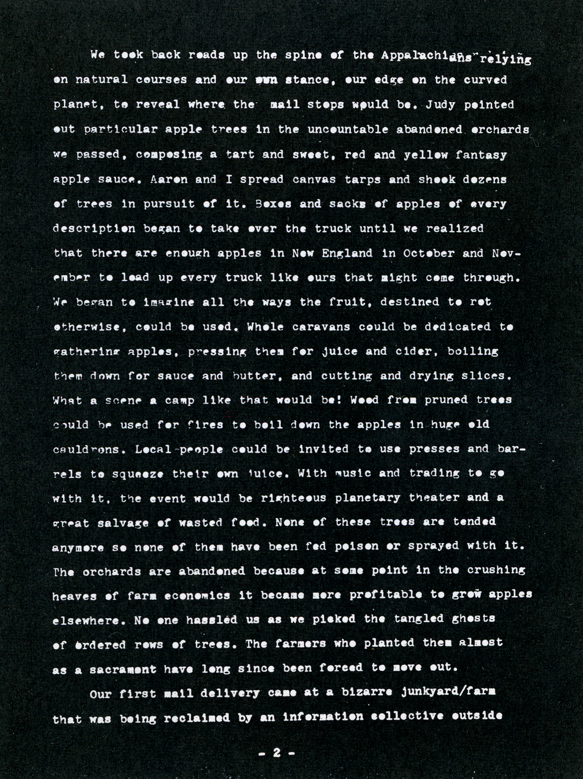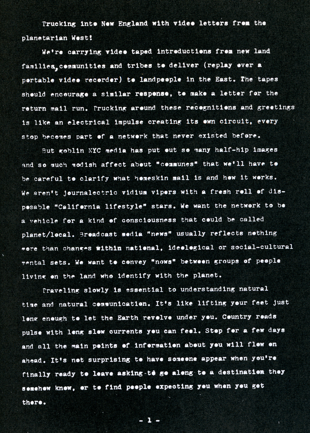 If the Credits were hard on the eyes, this was worse. No wonder I passed it by the first time through looking through the book for Peter’s piece. If you read it (see enlarged images of the individual pages, below) indeed it does sound like a newsletter. The title that was transcribed for Peter’s bibliography is actually the first part of the first sentence: “Trucking into New England with video letters from the planetarian West!”