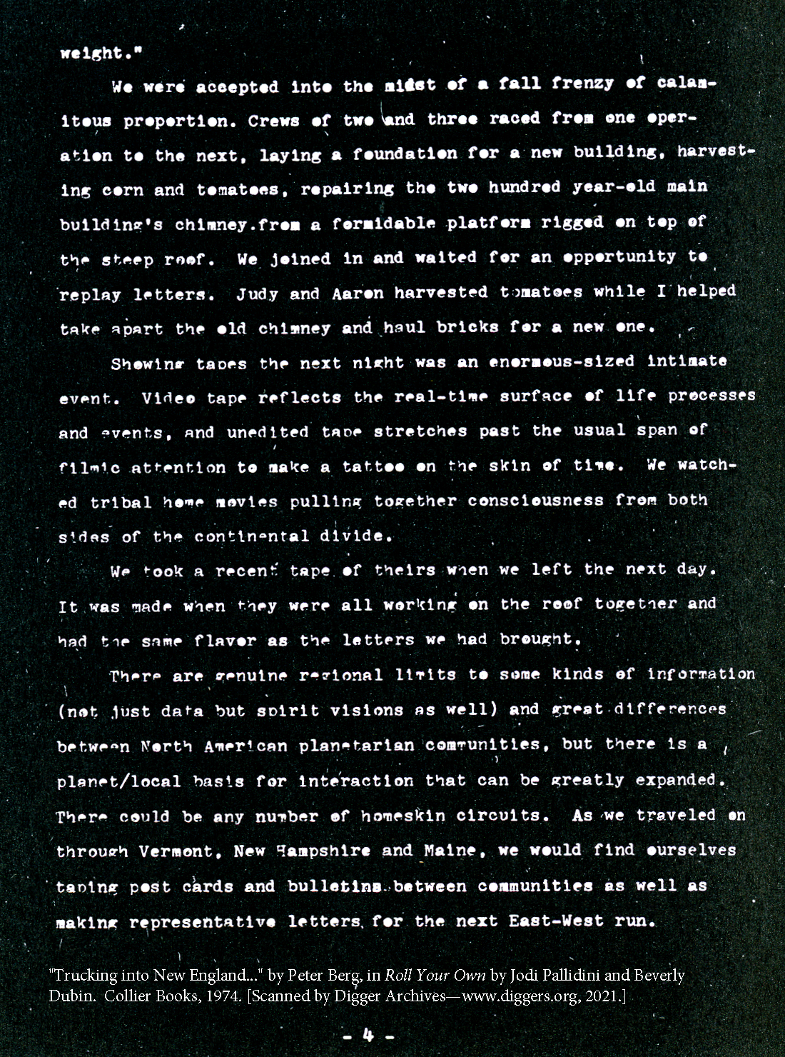 The reference in the bibliography of Peter’s writings was to an article titled “Trucking Into New England” and it was included in Jodi Palladini’s (aka Luna Moth’s) book Roll Your Own (co-edited with Beverly Dubin). I had never heard of this piece of writing by Peter so I was eager to track it down. Fortunately, the Summer of Love Archives book collection had a copy. Looking through it at first I was stymied. None of the chapters are attributed to particular authors. I didn’t find any chapter with the exact title “Trucking Into New England” but finally at the very end of the book is a listing of “Credits” and in the smallest print that these septuagenarian eyes can discern was this notation: “Newsletter, pp. 167-9: Peter Berg.” Here is what is on those two pages: